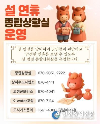 한편, 연휴 중 각종 불편사항 신고는 고성군청 당직실로 연락하면 된다.