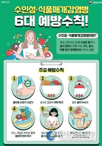 수인성·식품매개감염병 예방을 위해서는 ▲흐르는 물에 30초 이상 비누로 손 씻기 ▲음식은 충분히 익혀 먹기 ▲물은 끓여 마시기 ▲채소, 과일은 깨끗한 물에 충분히 씻어 먹기 등의 개인위생 수칙 준수가 중요하다.