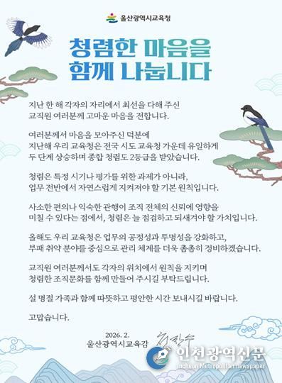 [인천광역신문] 관리자 기자 | 울산광역시교육청은 설 명절을 앞둔 12일 울산 지역 전 교육기관과 학교 교직원에게 청렴 의지를 다지는 ‘청렴 서한문’을 보냈다.