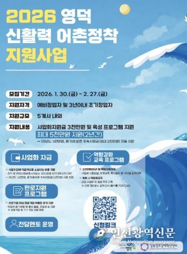 [인천광역신문] 관리자 기자 | 영덕군은 지역자원을 활용한 창업자를 발굴하고 육성하기 위해 ‘신활력 어촌정착 지원사업’에 참여할 창업자를 이달 27일까지 온라인으로 모집한다.