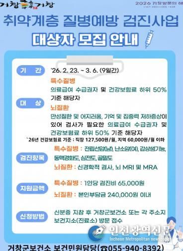 [인천광역신문] 관리자 기자 | 거창군은 의료 취약계층의 질병 조기 발견과 경제적 부담 완화를 위해 ‘2026년 취약계층 질병 예방 검진사업’ 대상자를 모집한다.