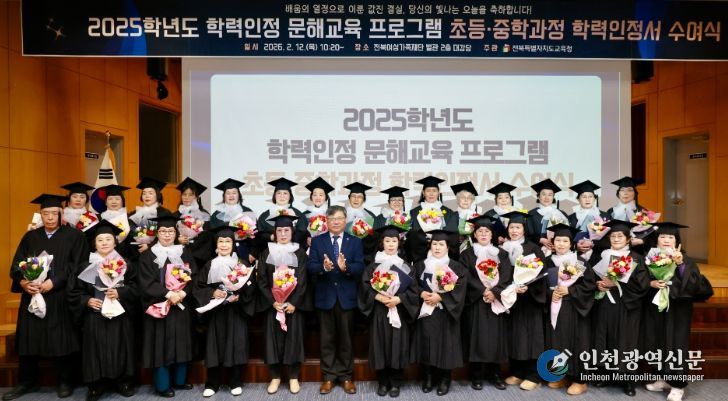 전북특별자치도교육청은 12일 전북여성가족재단 별관 2층 대강당에서 유정기 교육감 권한대행이 참석한 가운데 ‘2025학년도 학력인정 문해교육 프로그램 학력인정서 수여식’을 개최했다.