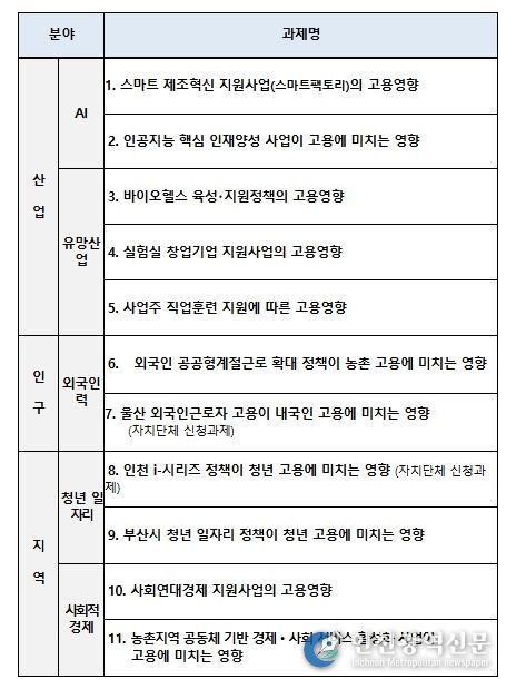 이날 회의에서는 2026년도 평가대상 후보과제에 대해서도 심의가 이뤄졌는데, 그간 고용 및 산업 전문가, 관계부처, 자치단체 등의 의견수렴 등을 거쳐 11개 후보과제가 발굴되었고, AI 등 유망산업분야(5개), 외국인 고용 등 인구구조분야(2개), 청년일자리・사회적 경제 등 지역정책분야(4개) 등 일자리에 영향을 미치는 주요 정책과제들로 확정되었다.
