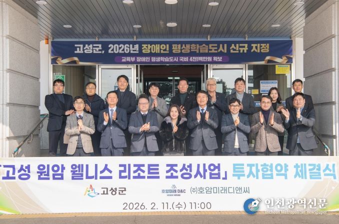 [인천광역신문] 관리자 기자 | 평화 경제 거점 도시 강원 고성군은 2월 11일 군청 본관 회의실에서 ㈜호암미래디앤씨(대표 전은영)와 '고성 원암 웰니스 리조트 조성사업' 투자 협약식을 체결했다고 밝혔다.