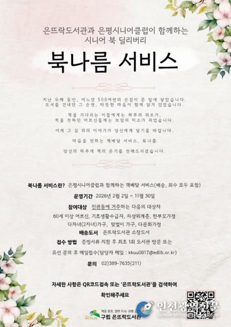 [인천광역신문] 관리자 기자 | 서울 은평구는 구립은뜨락도서관에서 운영하는 도서 배달 서비스 ‘북나름’을 이달부터 확대 운영한다고 밝혔다.