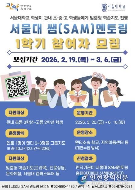 [인천광역신문] 관리자 기자 | 관악구는 서울대학교 사범대학과 함께 추진하는 ‘서울대 쌤(SAM) 멘토링’의 2026년도 1학기 참여기관을 모집한다.
