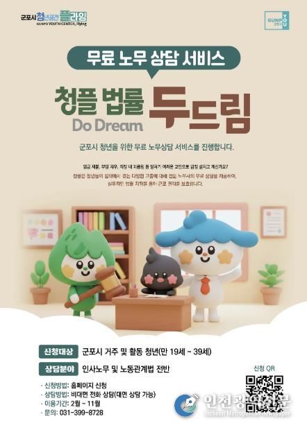 [인천광역신문] 관리자 기자 | 군포시 청년공간 플라잉은 관내 청년들의 노동권 보호와 일상생활 속 법률 고충 해결을 위해 무료 전문 상담 서비스인 ‘청플 법률 두드림(Do Dream)’을 본격 운영한다고 밝혔다.