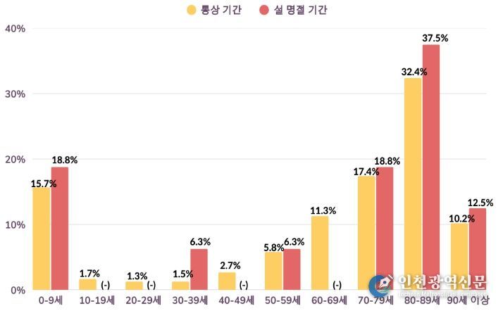 연령 구간별로는 설 명절 기간 발생한 기도폐쇄의 68.8%가 70대 이상에서 발생했다. 0~9세에서 18.8% 발생해 평소(15.7%) 대비 3.1%p 증가했고, 80~89세가 37.5%로 가장 많이 발생했으며, 평소(32.4%) 대비 증가율도 가장 높았다. 이를 통해, 0~9세, 70대 이상의 연령군은 각별히 주의해야 함을 확인할 수 있다.