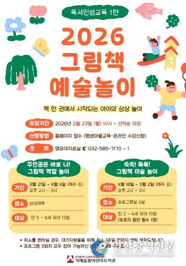 [인천광역신문] 관리자 기자 | 인천광역시교육청서구도서관은 영유아의 올바른 성장과 발달을 지원하기 위해, 오는 23일부터 독서인성교육 1탄‘그림책 예술 놀이’ 프로그램 참여자를 모집한다.