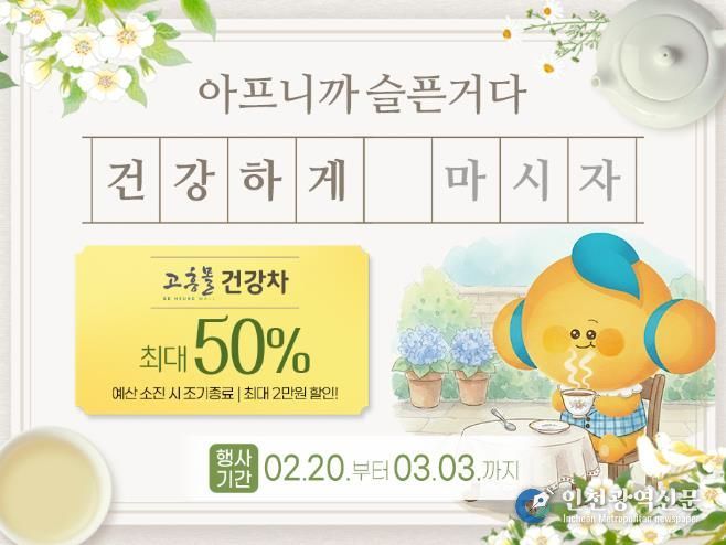 [인천광역신문] 관리자 기자 | 고흥군이 운영하는 온라인 농수축특산물 쇼핑몰 ‘고흥몰’은 환절기 건강 관리를 돕기 위한 ‘건강차 기획전’을 오는 2월 20일부터 3월 3일까지 진행한다고 밝혔다.