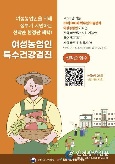 [인천광역신문] 관리자 기자 | 연천군은 여성농업인의 농작업 질환 예방과 건강복지 증진을 위해 관내 여성농업인 197명을 대상으로 여성농업인 특수건강검진을 실시한다.