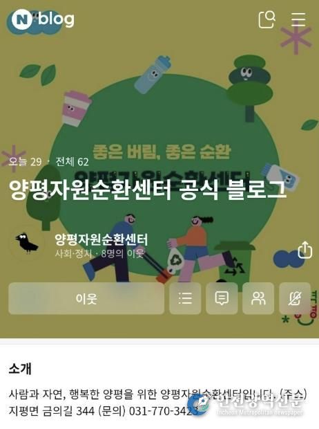 [인천광역신문] 관리자 기자 | 양평군은 지난 12일 군민과의 소통을 강화하고 자원순환 정보 전달을 확대하기 위해 ‘양평자원순환센터 공식 블로그’를 개설·운영한다고 밝혔다.