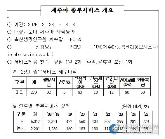 [인천광역신문] 관리자 기자 | 제주특별자치도 축산생명연구원이 오는 23일부터 6월 30일까지 제주마 사육농가를 대상으로 ‘무상 종부(교배) 서비스’를 운영한다.