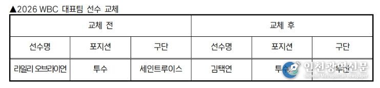 [인천광역신문] 관리자 기자 | KBO 전력강화위원회는 부상으로 인해 WBC 참가가 어려워진 세인트루이스 라일리 오브라이언을 대체할 선수로 두산 김택연을 확정하고 WBC 조직위에 선수 교체 승인을 요청했다.