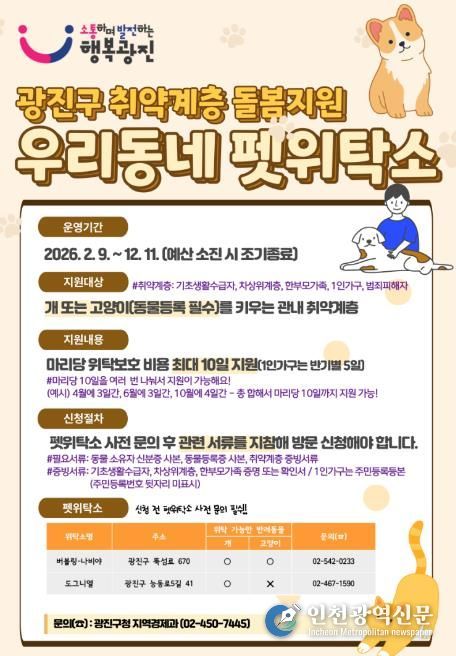 [인천광역신문] 관리자 기자 | 광진구가 갑작스러운 상황으로 인해 반려동물 임시보호가 필요한 취약계층을 위해 ‘우리동네 펫위탁소’를 운영한다.