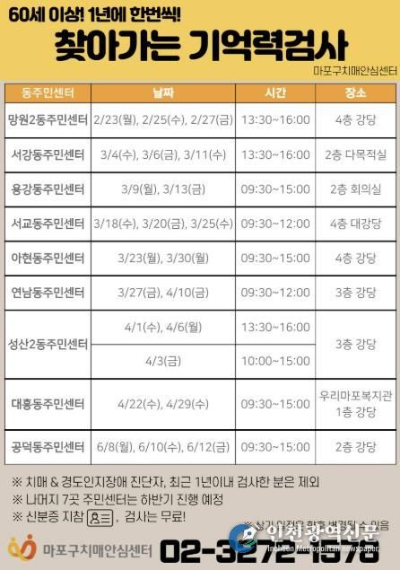 이번 검진은 마포구치매안심센터 전문 인력이 각 동 주민센터를 직접 방문해 진행하며, 60세 이상 마포구민이면 누구나 무료로 받을 수 있다.