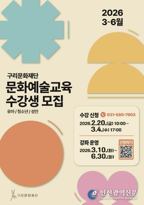 [인천광역신문] 관리자 기자 | (재)구리문화재단은 2026년 문화예술교육 상반기 강좌 수강 신청을 2월 20일(금)부터 선착순으로 접수한다고 밝혔다.
