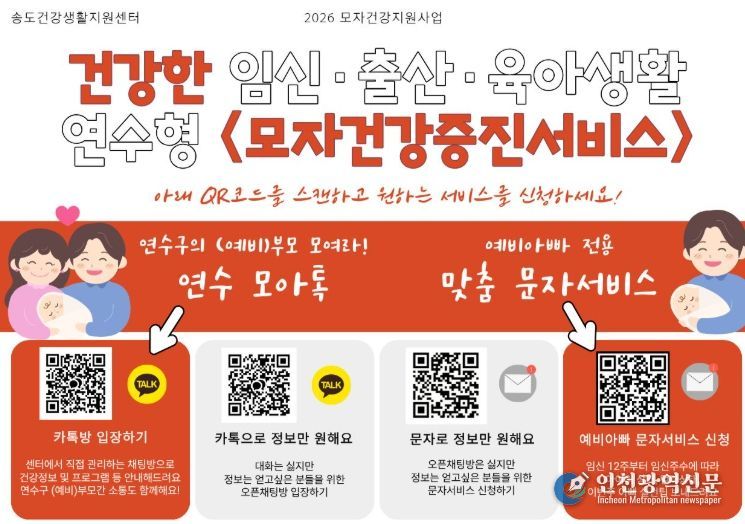 [인천광역신문] 관리자 기자 | 연수구 송도건강생활지원센터는 임산부와 영유아 부모를 위한 임신·육아 정보 소통 창구(플랫폼)인 ‘연수 모아(母兒)톡’을 구축하고, 이달 말부터 연중 운영한다.