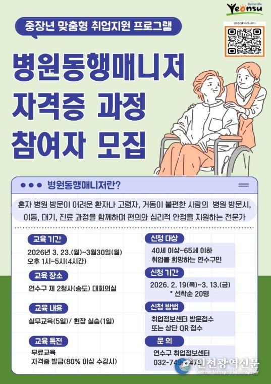 [인천광역신문] 관리자 기자 | 연수구는 고령화 사회에 대응하고 중장년층의 경력 전환을 지원하기 위해 직무교육, 현장실습, 자격증 취득, 취업 연계를 원스톱으로 지원하는 ‘병원동행매니저 자격증 과정’을 운영한다.