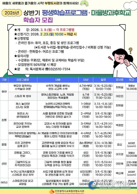 [인천광역신문] 관리자 기자 | 인천광역시교육청부평도서관은 지역 주민에게 배움의 즐거움을 전하고 성장의 기회를 제공하기 위하여, 23일부터 ‘상반기 정규 평생학습프로그램 및 마을방과후학교’학습자를 모집한다.