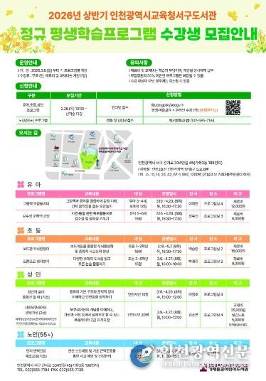[인천광역신문] 관리자 기자 | 인천광역시교육청서구도서관은 주민의 배움과 성장을 지원하기 위해, 오는 26일부터 상반기 정규 평생학습프로그램 학습자를 모집한다.