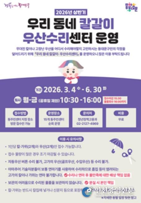 [인천광역신문] 관리자 기자 | 서울 동대문구는 ‘불편을 줄이는 공공서비스가 곧 일자리’라는 방향 아래, 3월 초부터 ‘찾아가는 방문 소독’과 ‘우리 동네 칼갈이·우산수리센터’를 본격 가동한다고 밝혔다. 행정이 먼저 움직여 주민 삶의 틈을 메우자는 취지다.