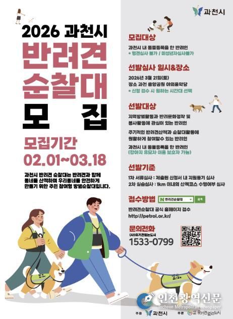 [인천광역신문] 관리자 기자 | 과천시가 반려견과 함께하는 산책 활동에 방범 순찰 기능을 접목한 ‘과천시 반려견순찰대’ 신규 대원을 오는 3월 18일 오후 4시까지 공개 모집한다.