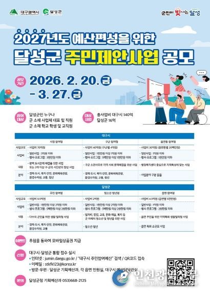 [인천광역신문] 관리자 기자 | 대구 달성군은 2026년 주민제안사업을 2월 20일부터 3월 27일까지 공모한다고 밝혔다.