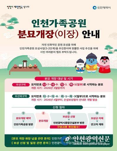 [인천광역신문] 관리자 기자 | 인천광역시 종합건설본부는 인천가족공원을 시민들의 쾌적한 휴식공간으로 탈바꿈하기 위한 ‘인천가족공원 조성사업(3-2단계)’의 분묘 보상 및 개정절차를 본격적으로 시행한다고 밝혔다.