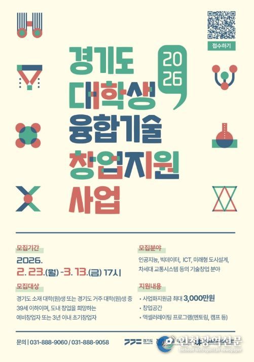 [인천광역신문] 관리자 기자 | 경기도와 차세대융합기술연구원은 ‘2026년 경기도 대학(원)생 융합기술 창업지원’ 사업 참가자를 다음 달 13일까지 모집한다.