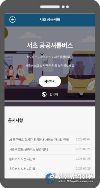 [인천광역신문] 관리자 기자 | 서울 서초구는 23일부터 서초종합체육관 공공 셔틀버스에도 실시간 위치안내 서비스를 도입해 주민의 이동 편의를 한층 더 높인다.