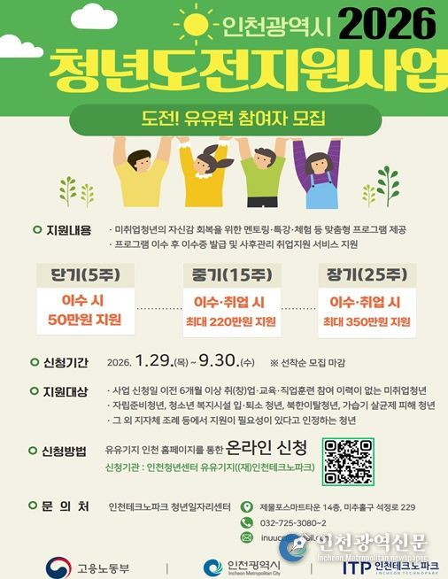 [인천광역신문] 관리자 기자 | 인천광역시는 청년의 경제활동 참여와 노동시장 진입을 지원하기 위해 ‘청년도전지원사업’ 참여자를 1월 29일부터 9월 30일까지 모집한다고 밝혔다.