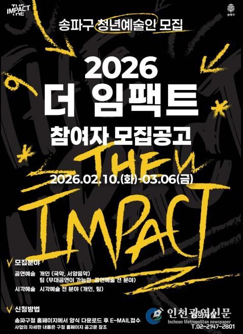 [인천광역신문] 관리자 기자 | 서울 송파구는 재능 있는 청년예술인을 발굴·지원하는 ‘2026 더 임팩트’ 참가자를 오는 3월 6일 오후 5시까지 모집 중이라고 23일 밝혔다. 이번 공모는 지난 2월 10일부터 접수가 진행되고 있다.