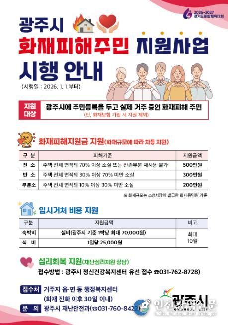 [인천광역신문] 관리자 기자 | 광주시가 주택 화재로 삶의 터전을 잃은 시민들의 생활 안정을 돕기 위해 화재 피해 지원제도를 본격 시행한다.