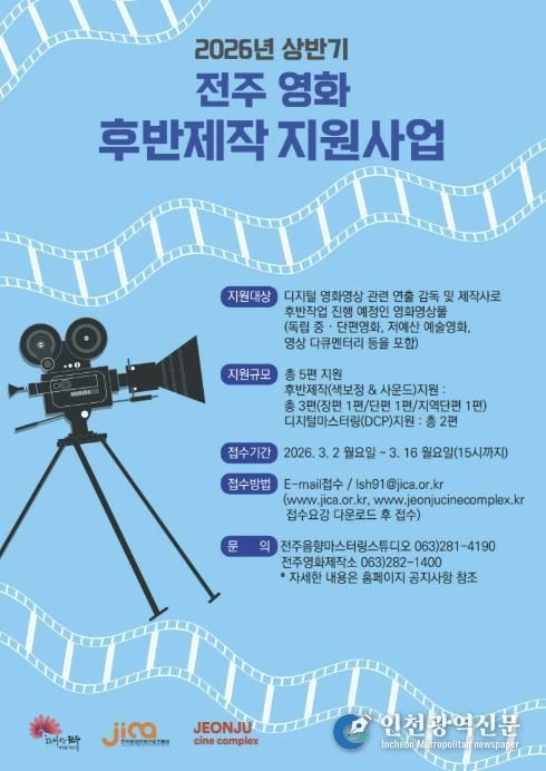 (재)전주정보문화산업진흥원과 전주영화제작소는 오는 3월 16일까지 대한민국 독립영화 제작 환경개선과 우수 작품을 발굴하기 위한 ‘2026년 상반기 전주 영화 후반제작지원 사업’에 참여할 작품을 공개 모집한다고 23일 밝혔다.