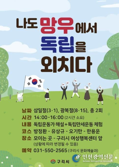 [인천광역신문] 관리자 기자 | 구리시는 오는 3월 1일 오후 2시부터 4시까지 망우산 묘역에서 ‘나도 망우에서 독립을 외치다’ 역사 체험 행사를 운영한다고 밝혔다.