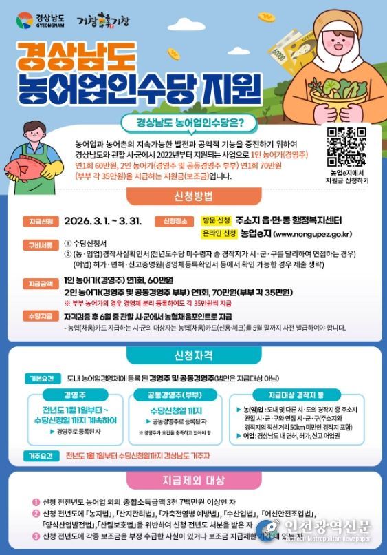 [인천광역신문] 관리자 기자 | 거창군은 농어촌의 공익적 기능 증진과 농어업인의 소득 안정을 도모하기 위한 ‘2026년 농어업인수당 지원사업’을 오는 3월 3일부터 31일까지 신청받는다.