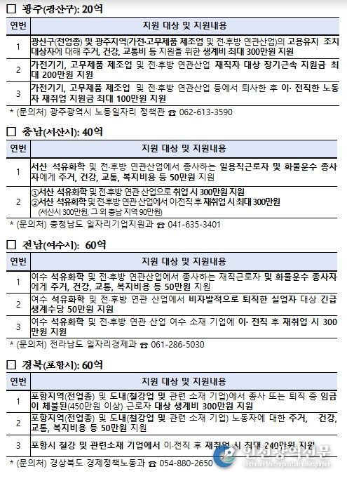 특히, 전남과 충남은 석유화학 업종 및 전·후방 연관산업의 특성을 반영하여, 지원 범위를 일용직 노동자와 화물 운수 종사자까지 확대할 계획이며, 경북의 경우 철강업 등 주력산업 업황 악화로 고충이 가중된 임금체불 노동자에 대한 긴급생계 지원책을 마련·추진해 나갈 계획이다.