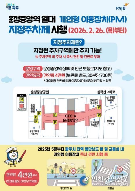 [인천광역신문] 관리자 기자 | 파주시는 운정중앙역 일대 ‘개인형 이동장치(PM) 지정주차제’를 2월 26일부터 본격 시행한다고 24일 밝혔다.