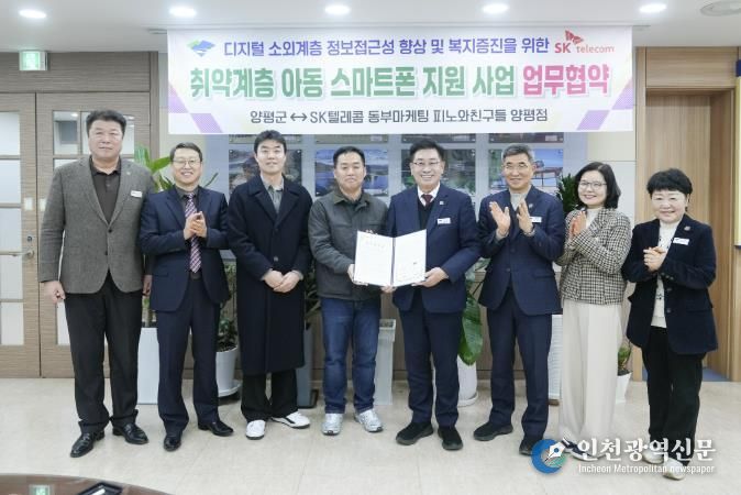 [인천광역신문] 관리자 기자 | 양평군은 지난 23일 SK텔레콤 동부마케팅 ‘피노와친구들’ 양평점과 ‘취약계층 아동 스마트폰 지원 사업’의 원활한 추진을 위한 업무협약을 체결했다고 밝혔다.