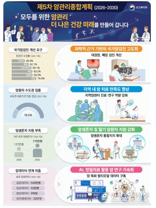 [인천광역신문] 관리자 기자 | 보건복지부는 2월 24일 국가암관리위원회(위원장: 이형훈 제2차관)를 개최하여, 「제5차 암관리종합계획(2026~2030)」을 심의ㆍ의결했다.