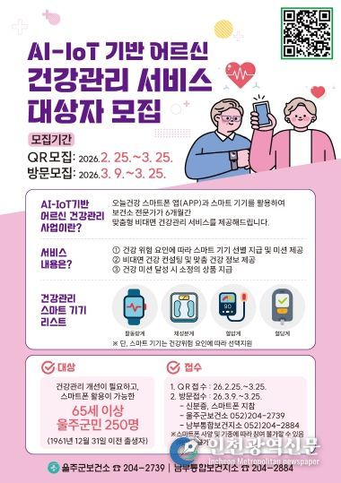 [인천광역신문] 관리자 기자 | 울주군보건소가 지역 어르신의 건강한 노후를 위해 스마트 기술을 접목한 ‘AI·IoT 기반 어르신 건강관리사업’을 실시한다고 25일 밝혔다.