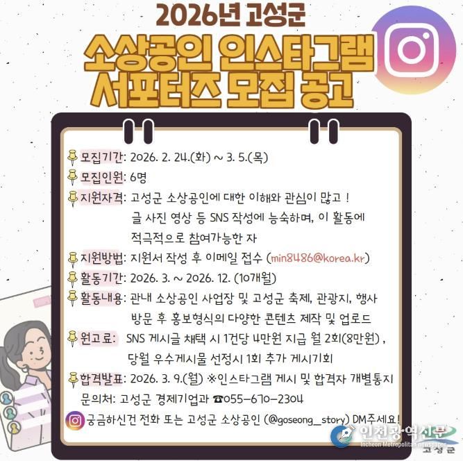 [인천광역신문] 관리자 기자 | 고성군은 고성의 맛과 멋을 알릴 맛집, 소상공인 사업장 및 각종 소상공인 지원시책 등을 소개할 공식 인스타그램 홍보 서포터즈를 모집한다.