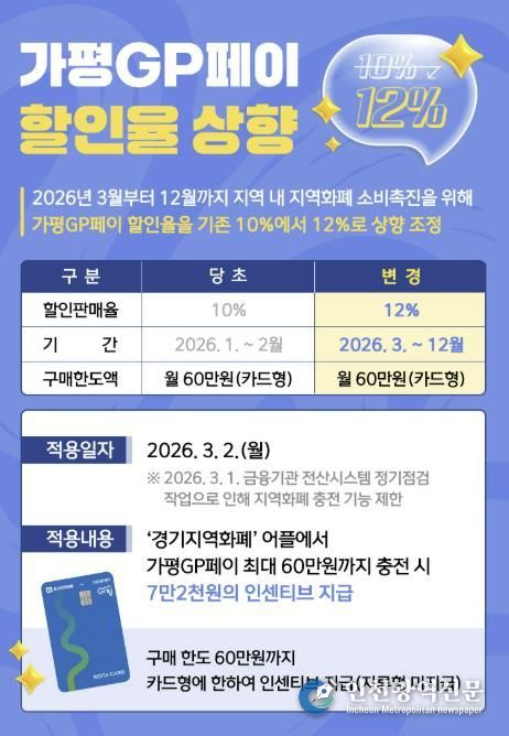 [인천광역신문] 관리자 기자 | 가평군은 오는 3월부터 지역화폐인 ‘가평GP페이’ 인센티브를 기존 10%에서 12%로 상향한다고 밝혔다. 다만 금융기관 시스템 점검으로 인해 충전은 3월 2일 0시부터 가능하다.