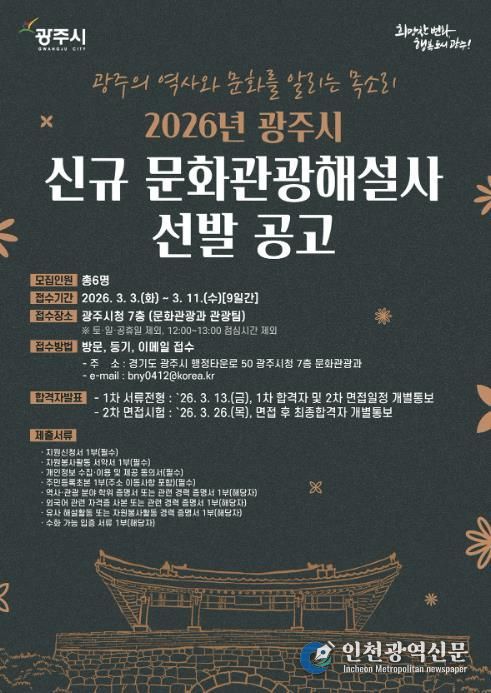 [인천광역신문] 관리자 기자 | 광주시는 2026년도 광주시 문화관광 해설사 신규 선발을 위해 오는 3월 3일부터 11일까지 원서 접수를 실시한다고 25일 밝혔다.