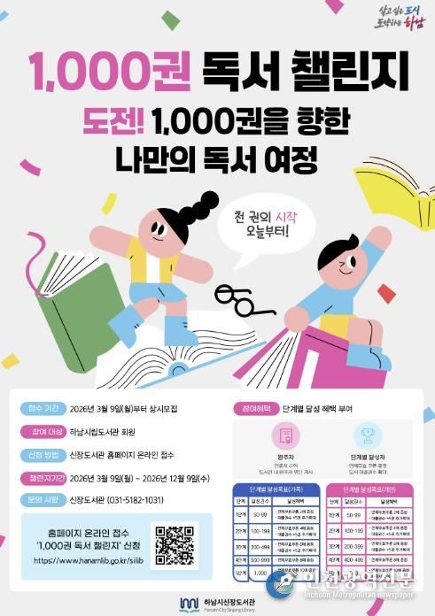 [인천광역신문] 관리자 기자 | 하남시신장도서관은 시민의 지속적인 독서 참여와 생활 속 읽기 습관 정착을 위해 오는 3월 9일부터 ‘1,000권 독서 챌린지’를 운영한다.