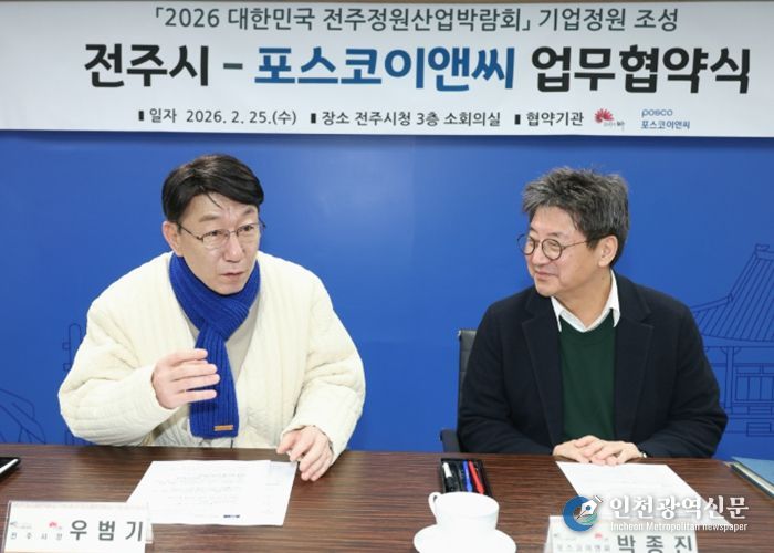 전주시와 ㈜포스코이앤씨은 25일 시청 3층 소회의실에서 우범기 전주시장과 박종진 ㈜포스코이앤씨 건축사업본부장 등 양 기관 관계자들이 참석한 가운데 ‘2026 대한민국 전주정원산업박람회 기업동행정원 조성을 위한 업무협약’을 체결했다.