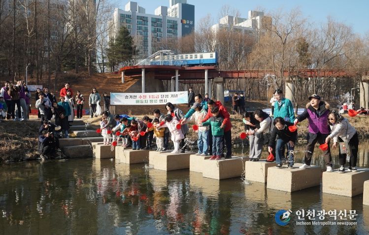 연수구는 25일 승기천 연수체육공원 일대에서 주민, 자원봉사자, 관계기관, ‘1사1하천 가꾸기 운동’ 참여기업 등 200여 명이 참여한 가운데 ‘승기천 수질 1등급 달성 기념 환경정화 및 버들치 방류 행사’를 개최했다.