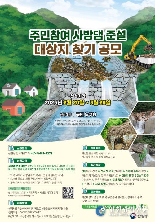 [인천광역신문] 관리자 기자 | 산림청은 주민이 직접 사방댐 준설 대상지를 신청하는 ‘주민참여 사방댐 준설 대상지 찾기 공모’를 오는 3월 20일까지 실시한다고 밝혔다.
