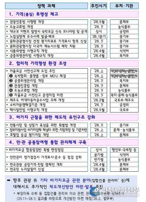 정부는 이번 대책에 따른 제도개선을 위해 관련 법령개정 등 후속조치를 신속히 추진할 예정이다. 또한, 주요 과제들이 현장에 빠르게 안착되어 바가지요금이 근절될 수 있도록 지방정부 및 유관 협・단체와 긴밀히 협조하는 한편, 대책의 주요 내용들을 국민과 업계에 신속히 알리고 과제 추진 상황을 면밀히 모니터링할 계획이다.